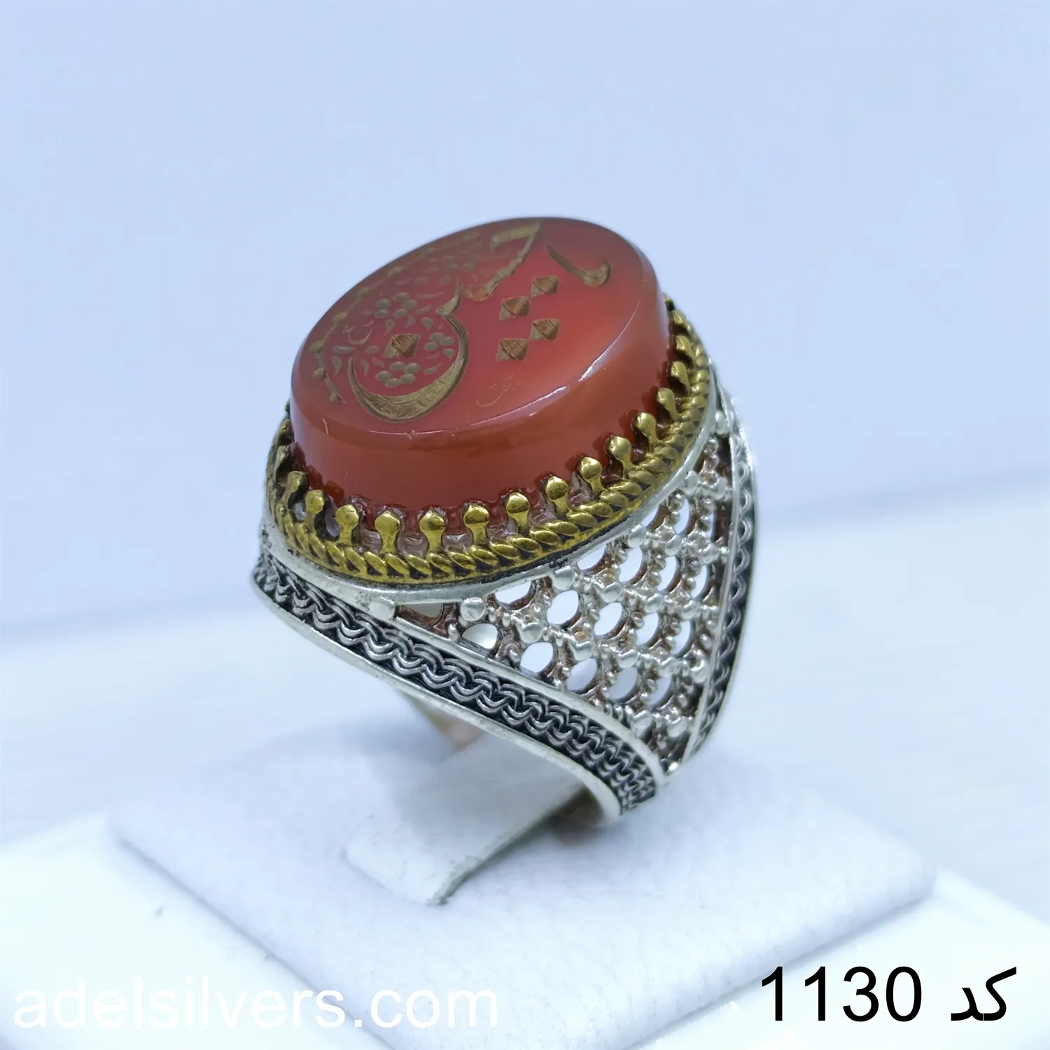 انگشتر نقره عیار 925 مردانه تاج برنجی با نگین عقیق سرخ یمانی (یمن) 100% طبیعی و معدنی ، حکاکی دست نویس ذکر “یا حسین”.